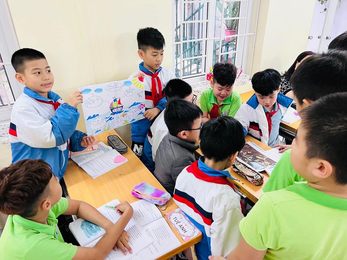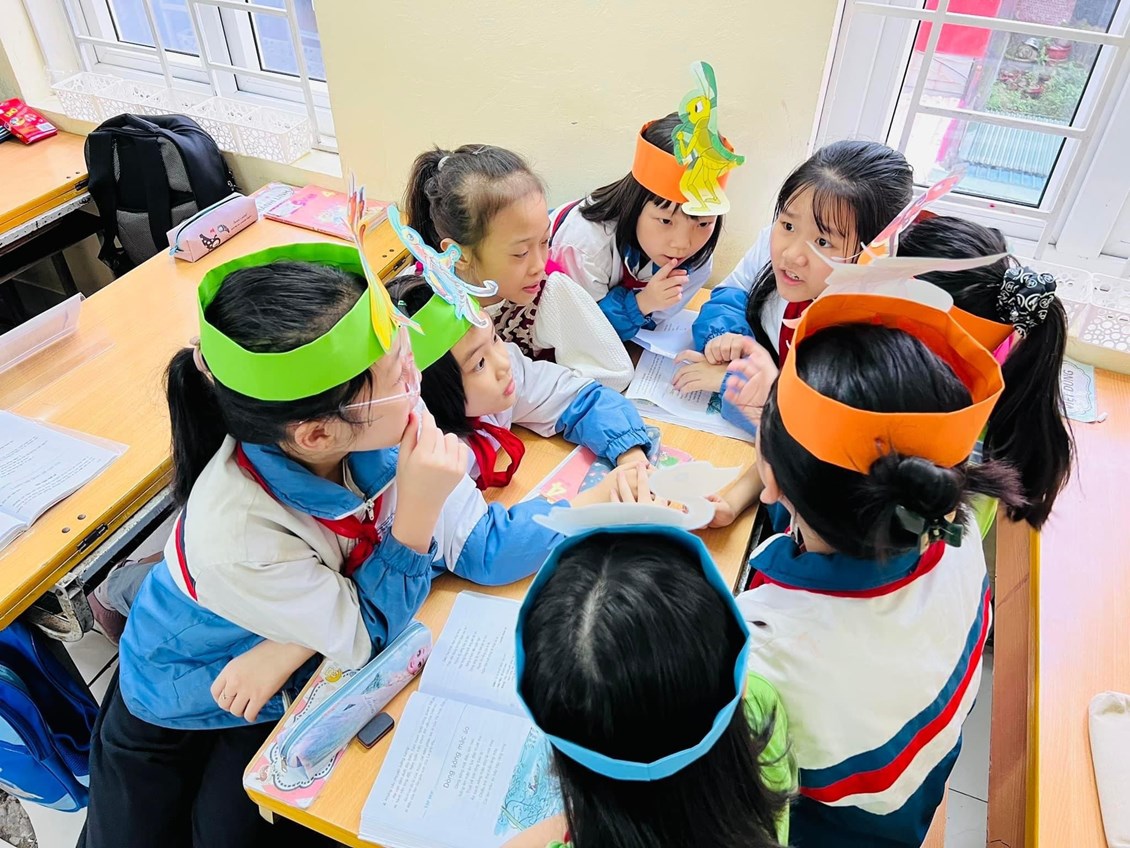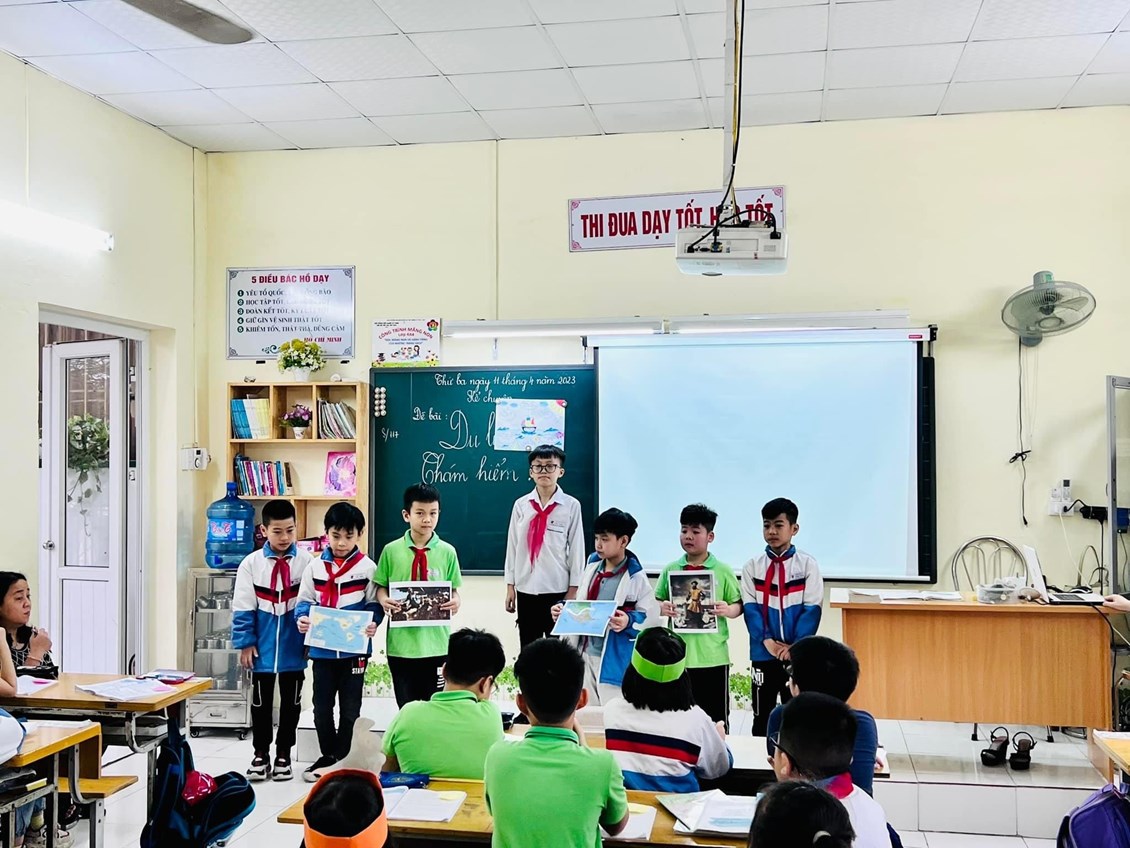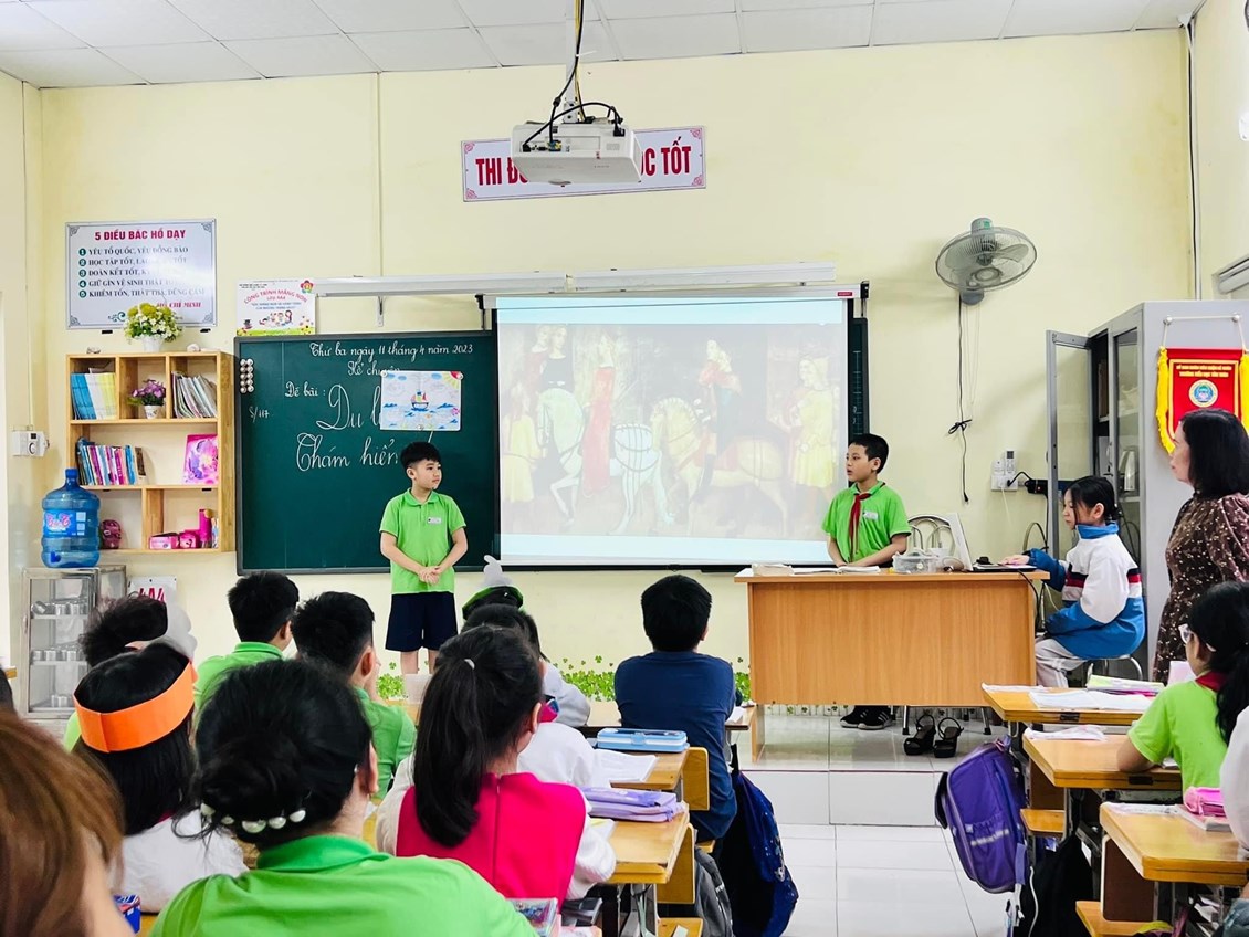✈️ Xuyên suốt cả tiết học, cô giáo đã sử dụng kĩ thuật góc, làm việc nhóm,….; học sinh được tự mình chuẩn bị tư liệu hình ảnh, đạo cụ và PPT; nhập vai vào những nhân vật để kể câu chuyện mà các em đã nghe, đã đọc. Nhiều câu chuyện được các em học sinh sân khấu hóa với những hoạt cảnh minh họa sáng tạo, sinh động và hấp dẫn đem đến một bầu không khí học tập vui vẻ.