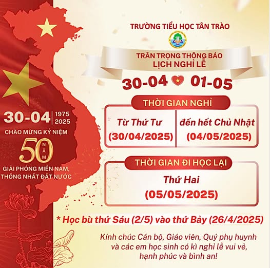 TRƯỜNG TH TÂN TRÀO TRÂN TRỌNG THÔNG BÁO LỊCH NGHỈ LỄ 30/4 VÀ 1/5/ 2025